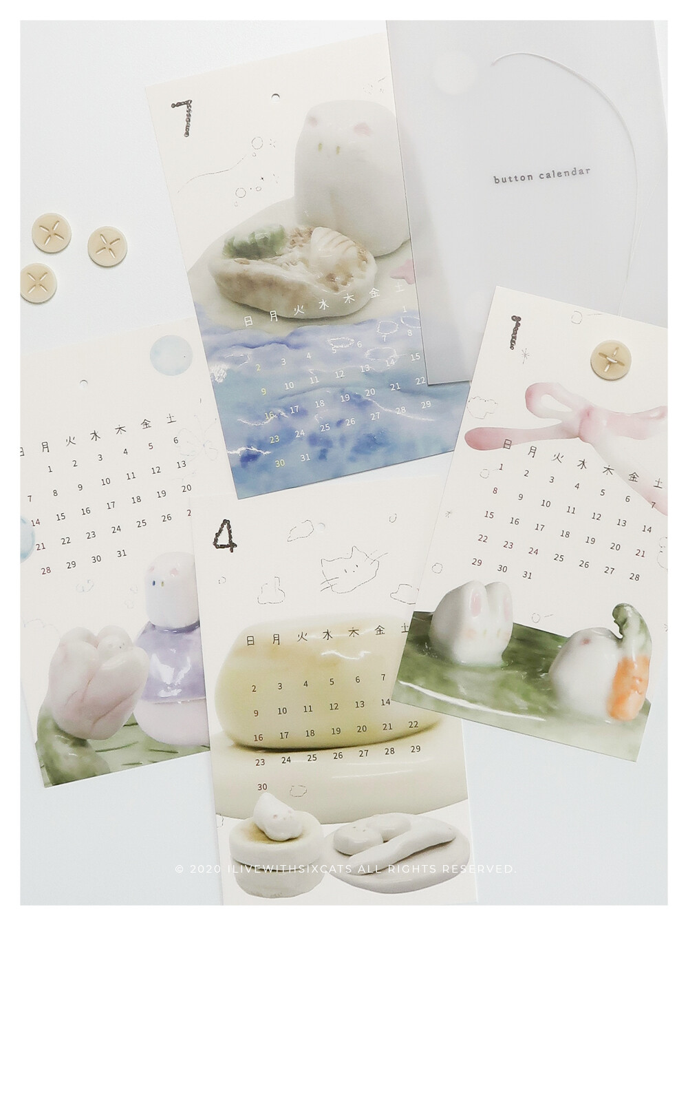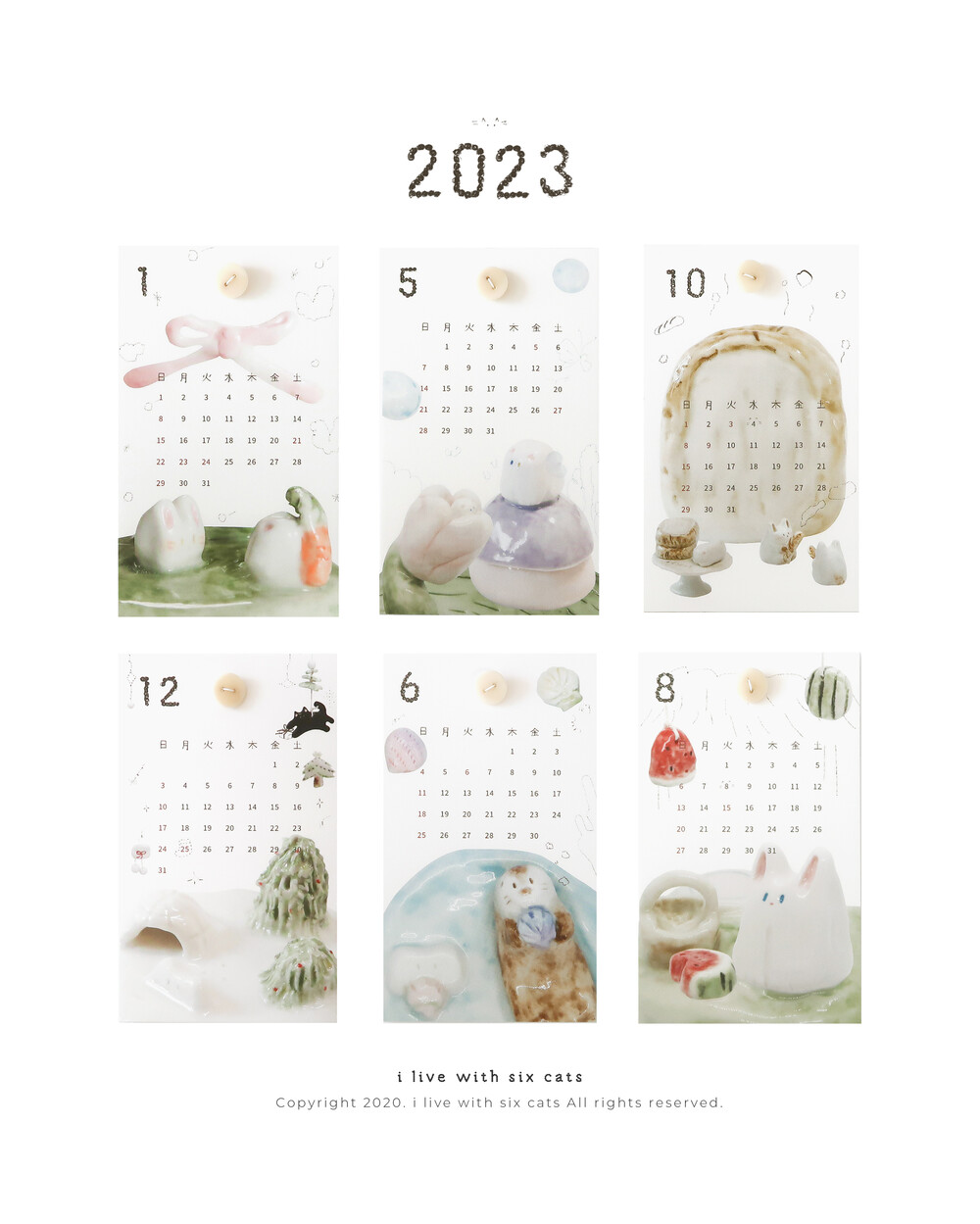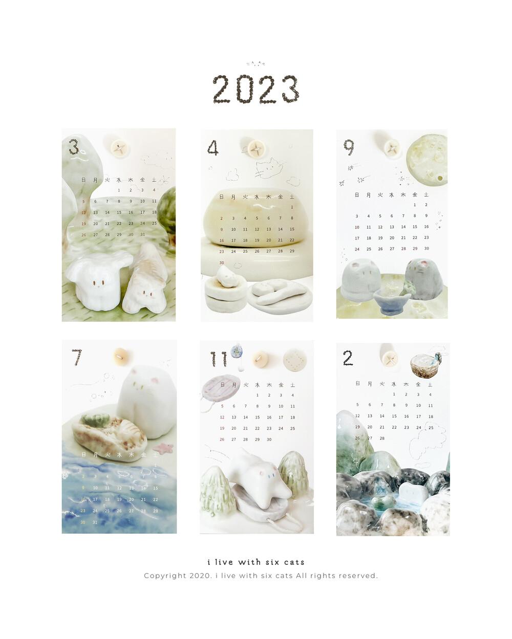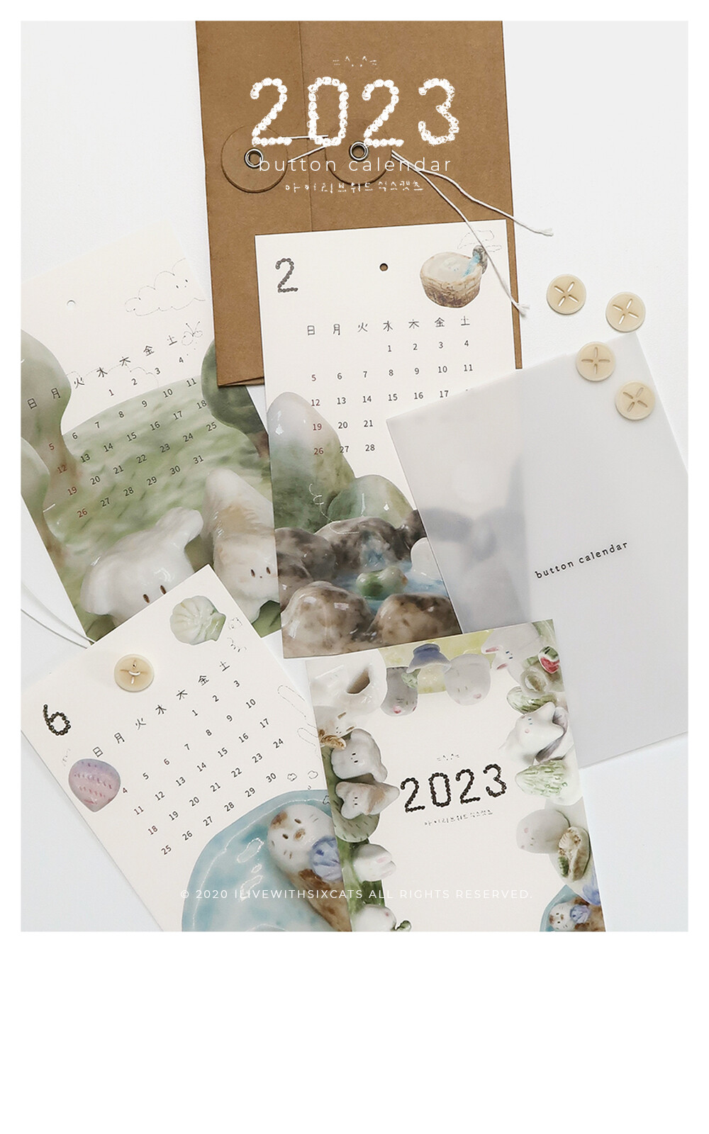 2023 버전으로 돌아온 버튼 카렌다입니다. i live with six cats의 주간 도자기들을 모아서 재구성한 이미지들로 만들었어요.