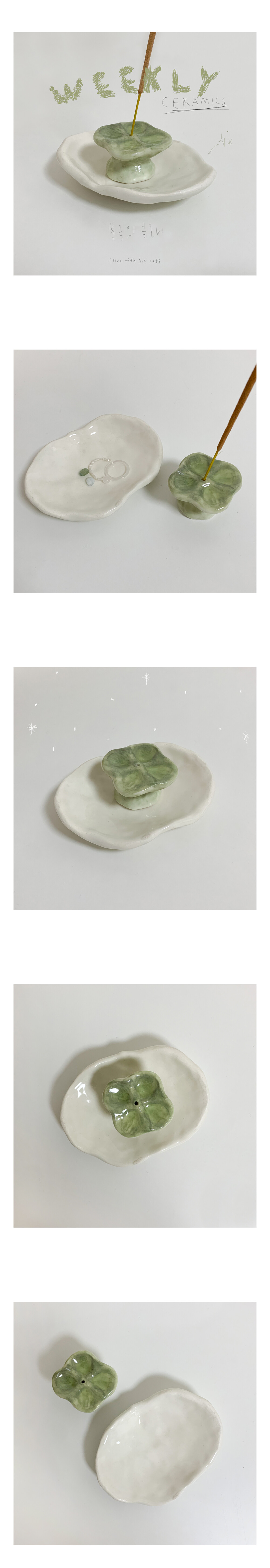 네 잎 클로버 인센스 홀더와 작은 그릇으로 구성되어 있어요. 둘을 분리해서 각각 사용하실 수 있습니다. 🍀