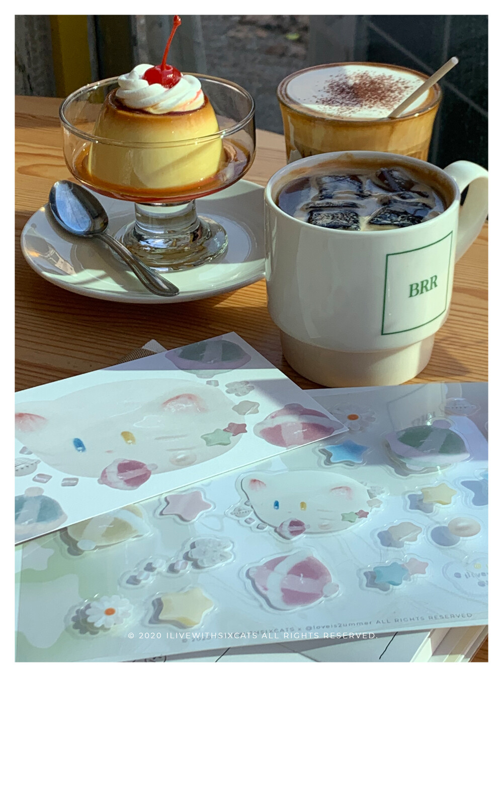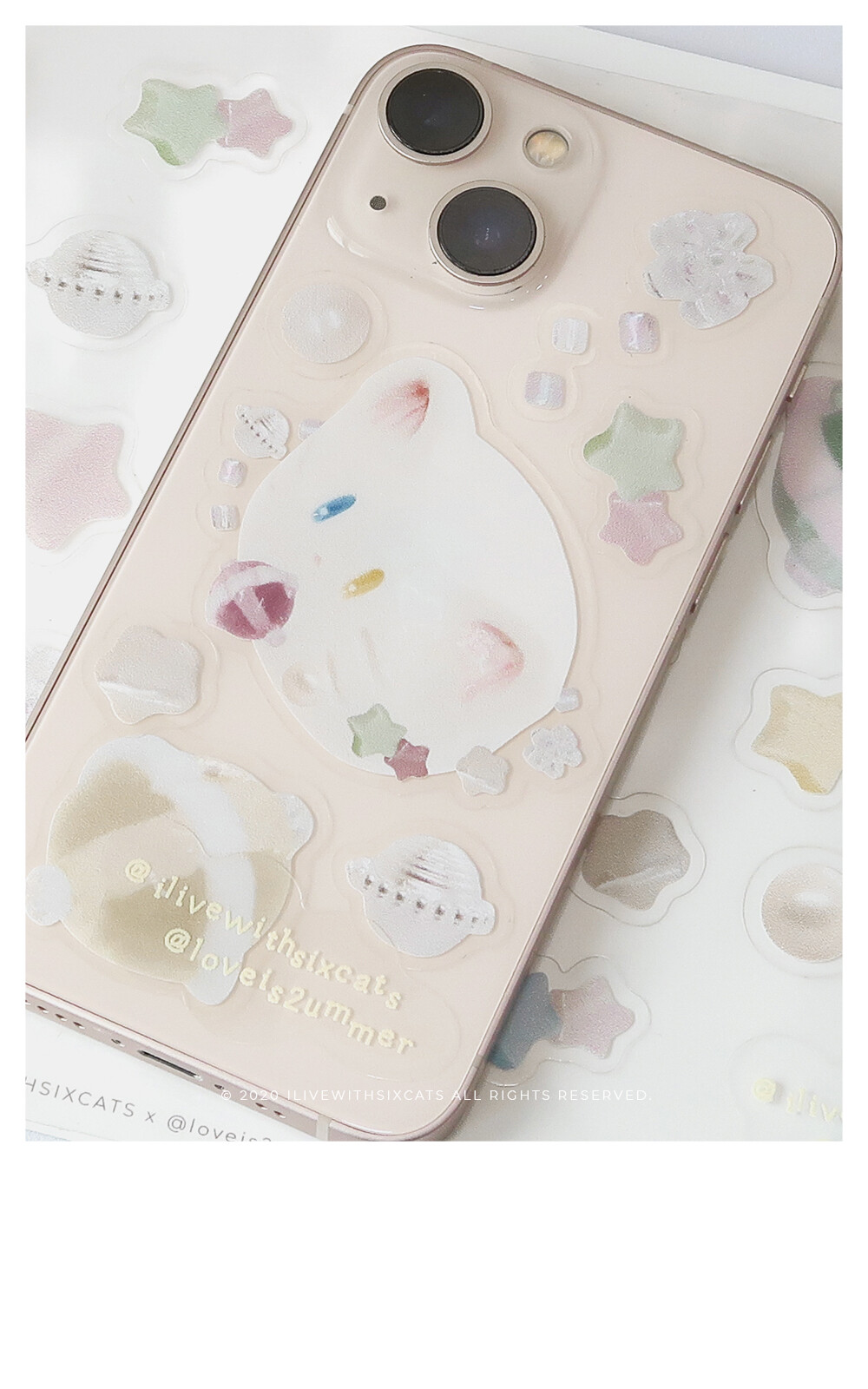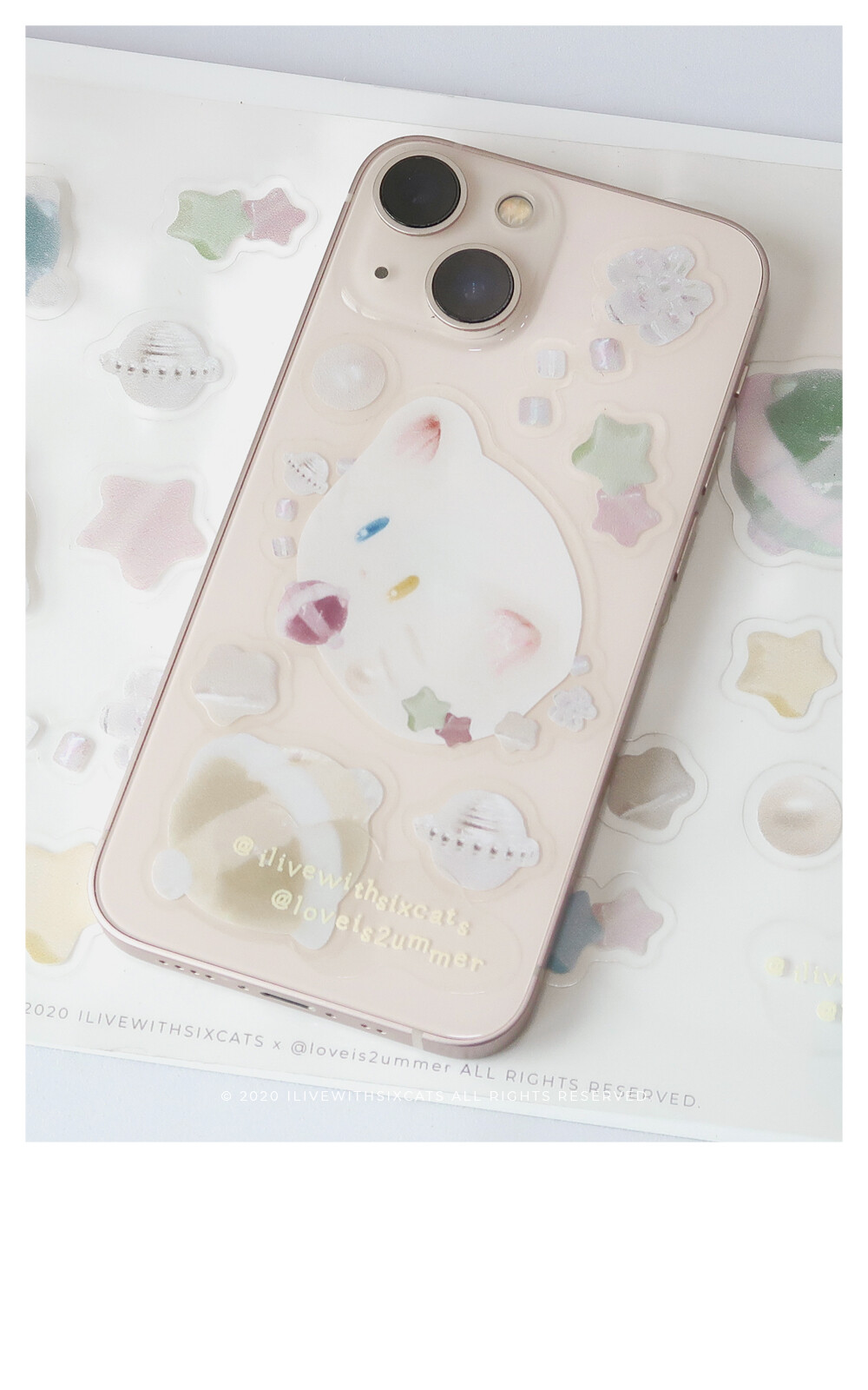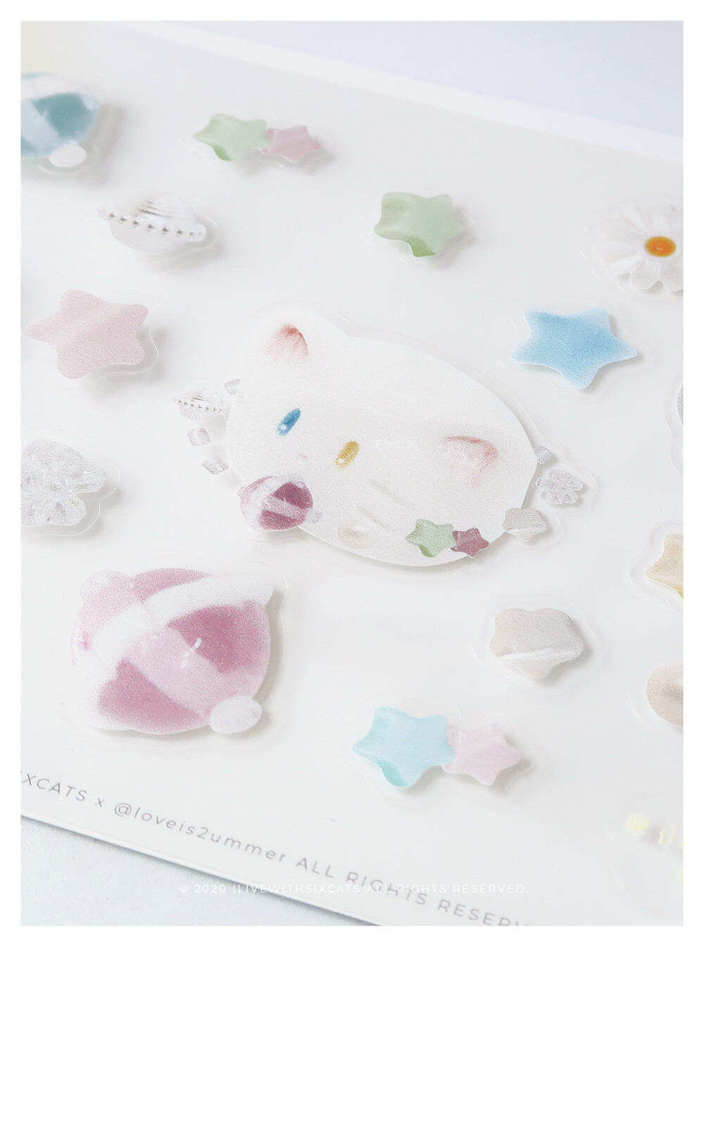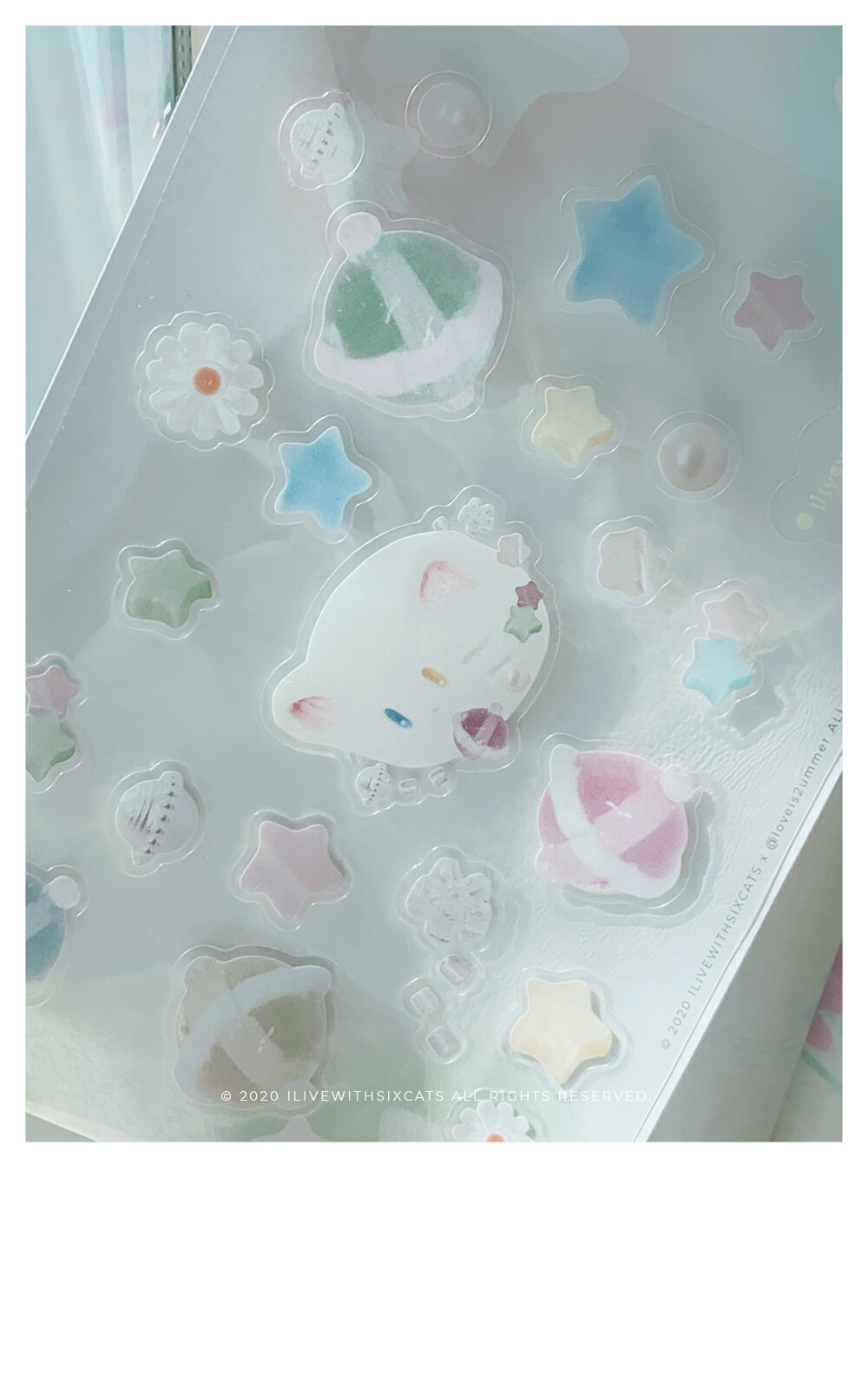 커다란 고양이를 중심으로 빛나는 행성들을 엽서와 스티커로 만들어봤어요.