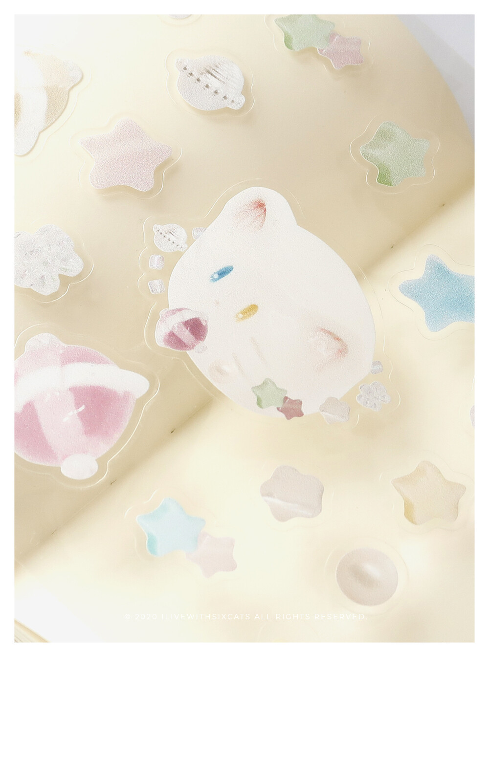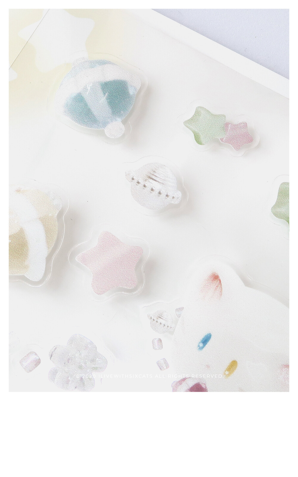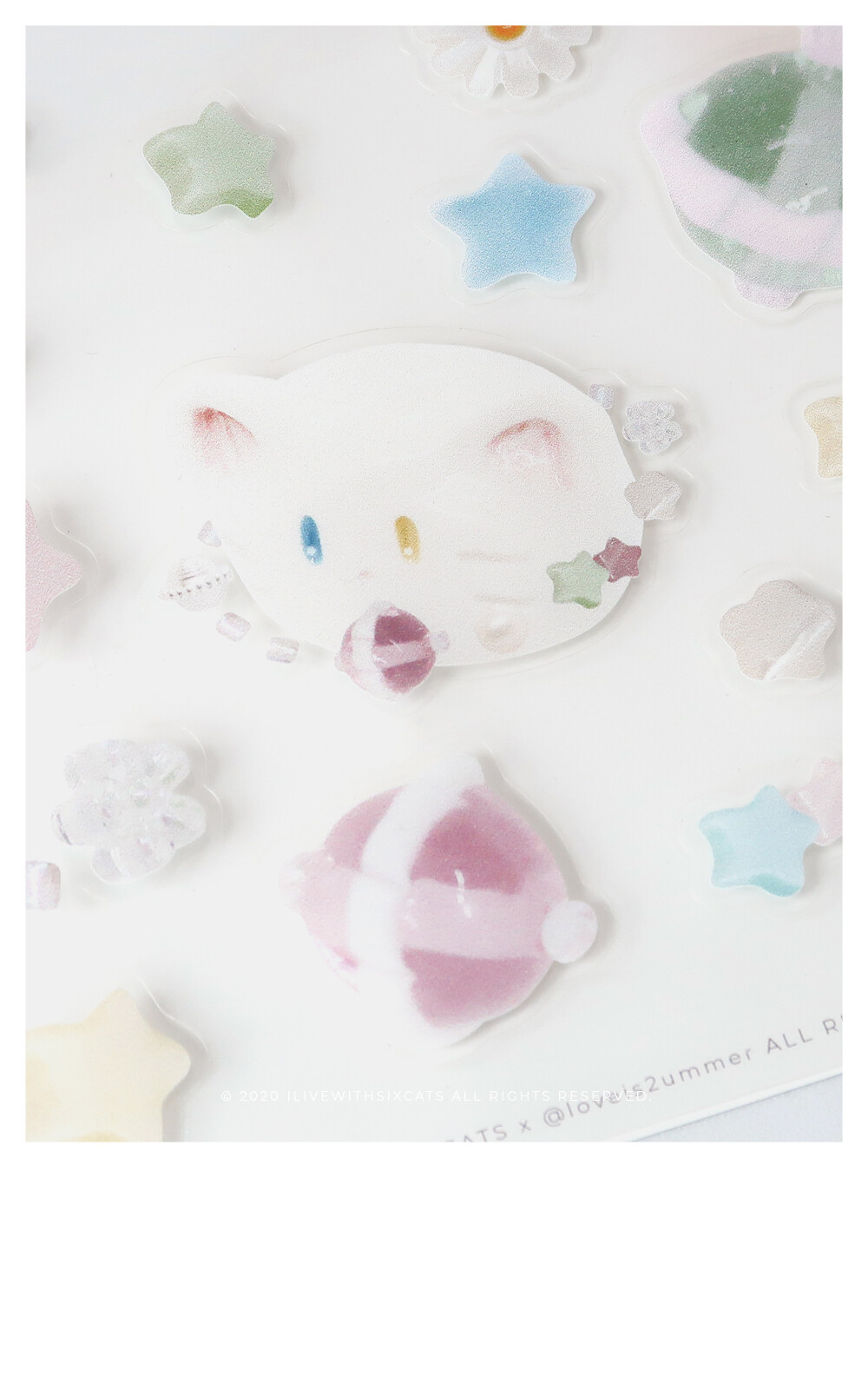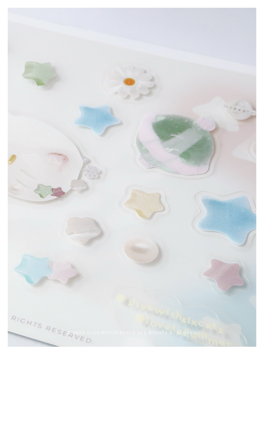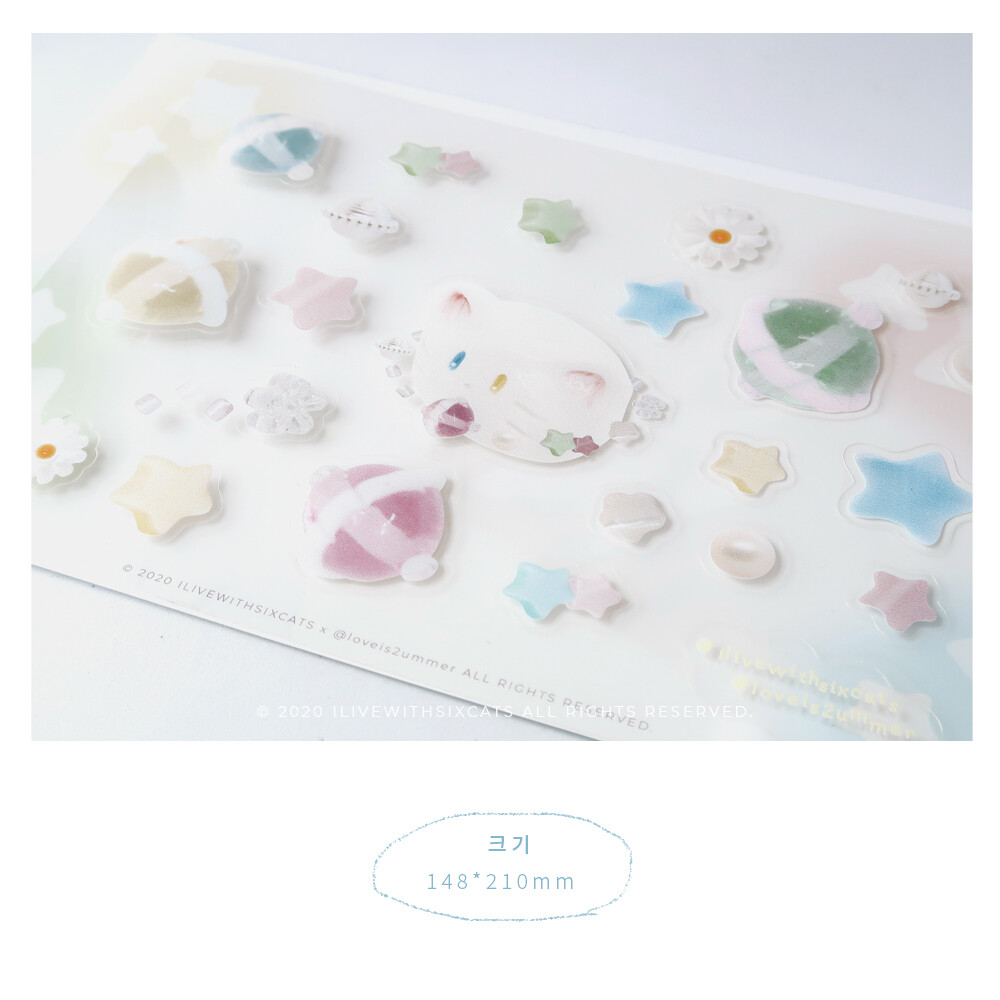 커다란 고양이를 중심으로 빛나는 행성들을 엽서와 스티커로 만들어봤어요.
