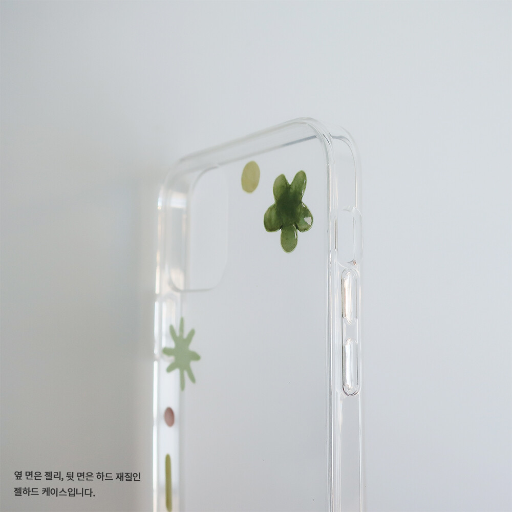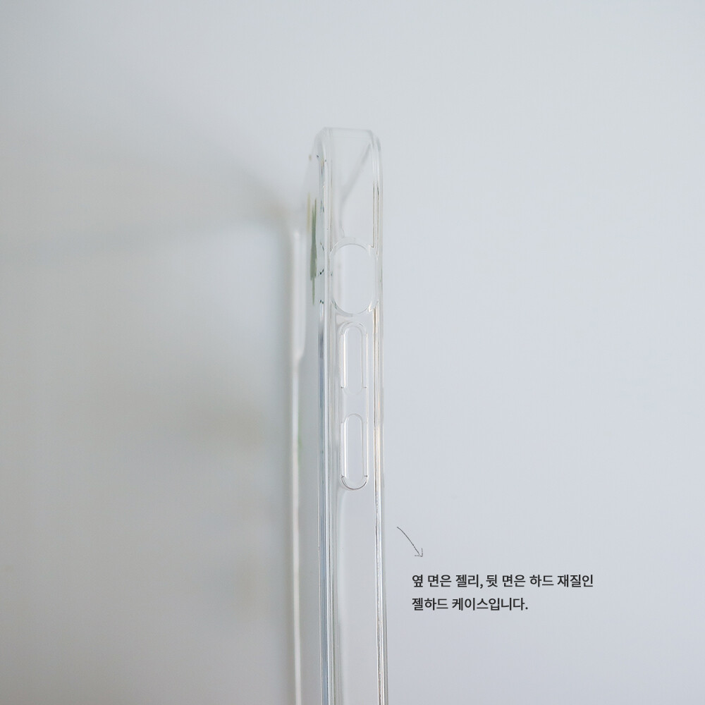 젤하드 핸드폰 케이스로 뒷면은 하드(아크릴), 옆면은 단단한 젤리 재질로 되어 있어 튼튼하고 황변현상이 적습니다.