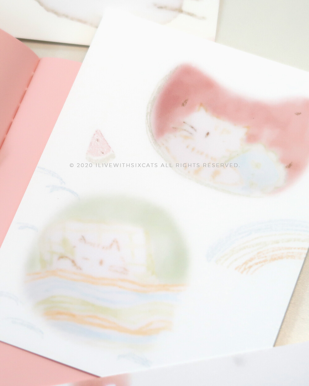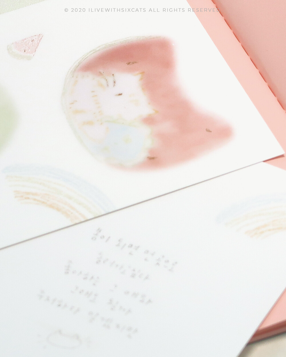 수박 먹는 꿈을 꾸는 고양이 (수박을 너무 좋아해서 꿈에서도 수박을 먹어요. =^. .^= 🍉) 도자기에 그린 그림으로 만든 엽서입니다.