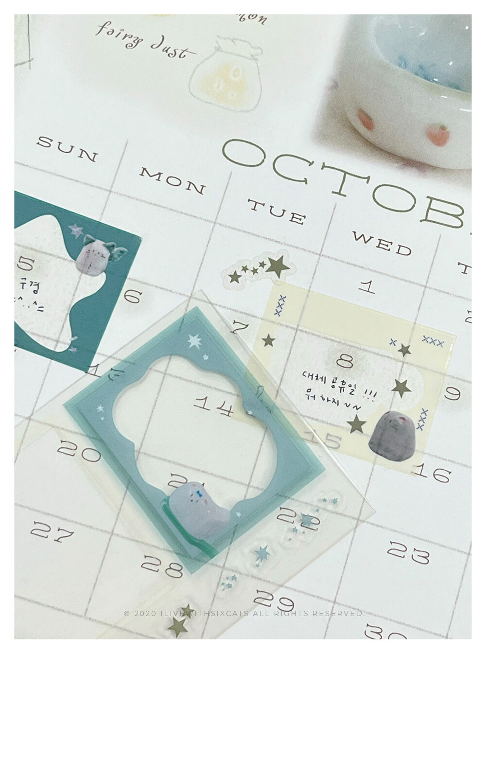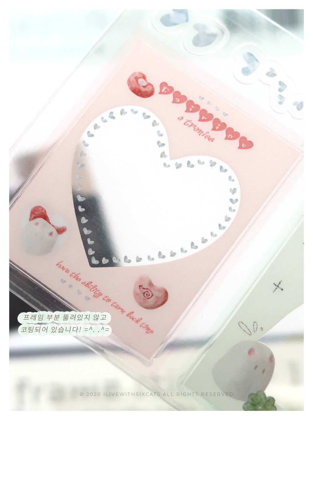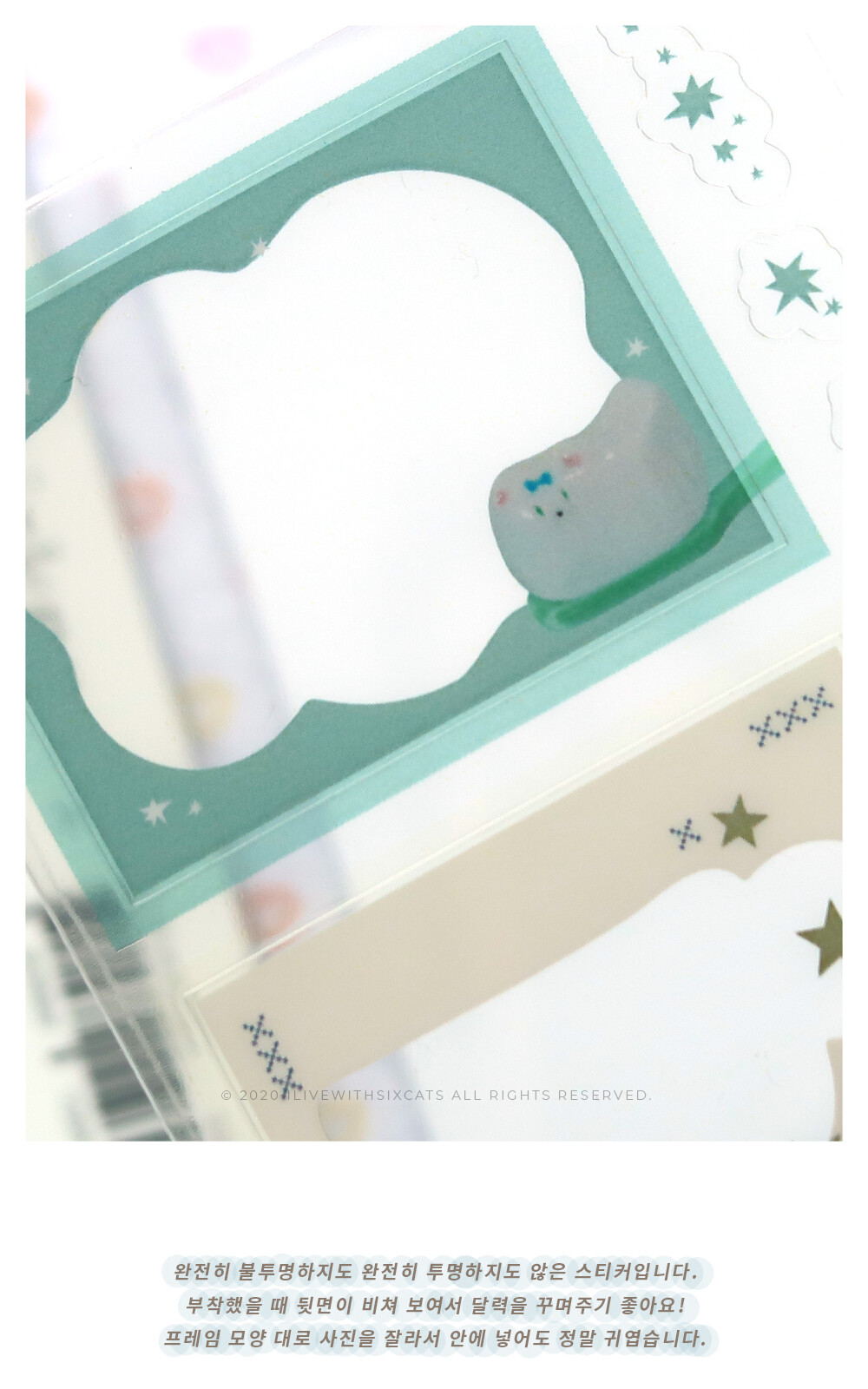 완전히 불투명하지도 완전히 투명하지도 않은 스티커입니다. 부착했을 때 뒷면이 비쳐 보여서 달력을 꾸며주기 좋아요! 프레임 모양 대로 사진을 잘라서 안에 넣어도 정말 귀엽습니다. 프레임 부분은 뚫려있지 않고 코팅되어 있습니다.