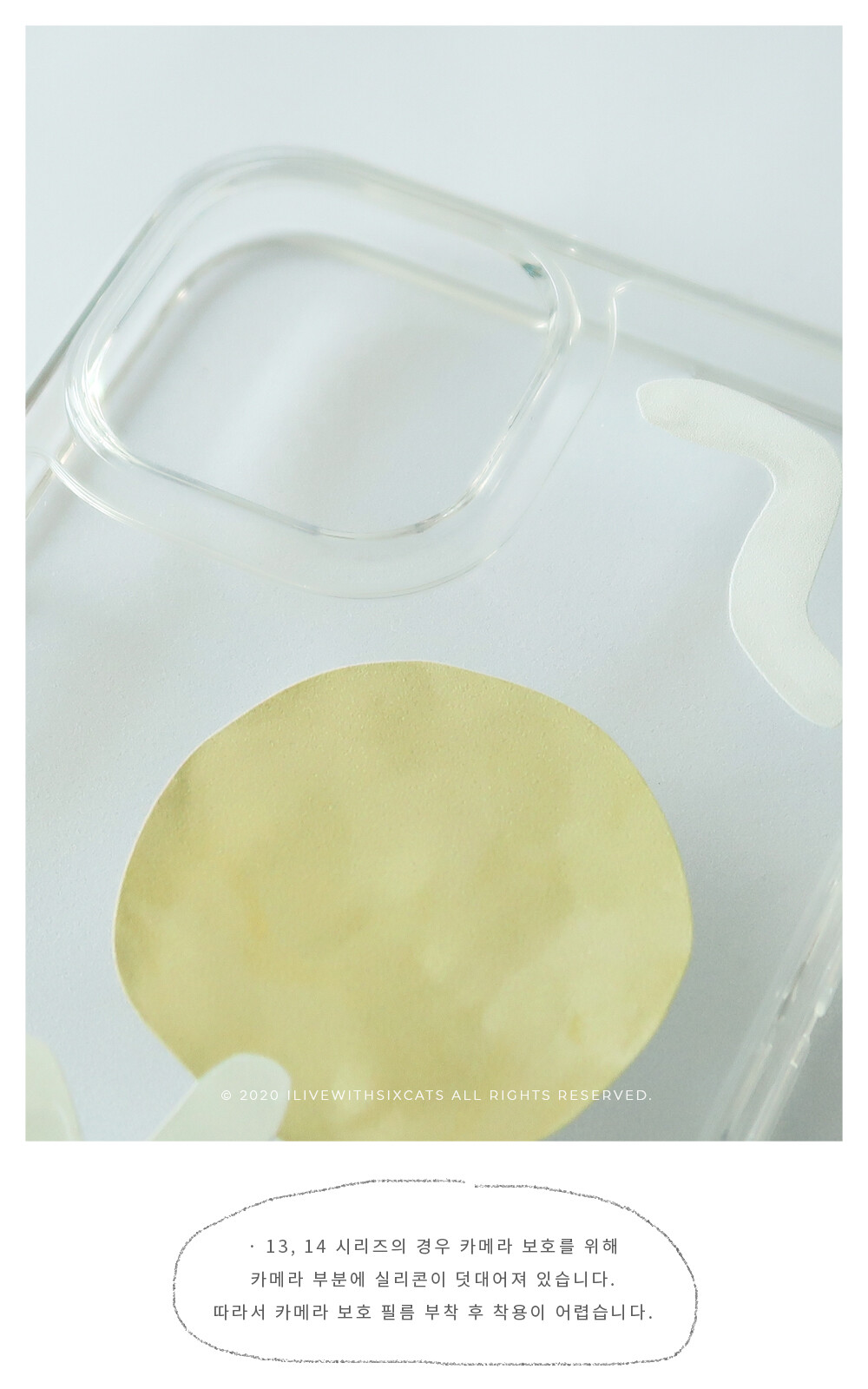 · 13, 14 시리즈의 경우 카메라 보호를 위해 카메라 부분에 실리콘이 덧대어져 있습니다. 따라서 카메라 보호 필름 부착 후 착용이 어렵습니다.