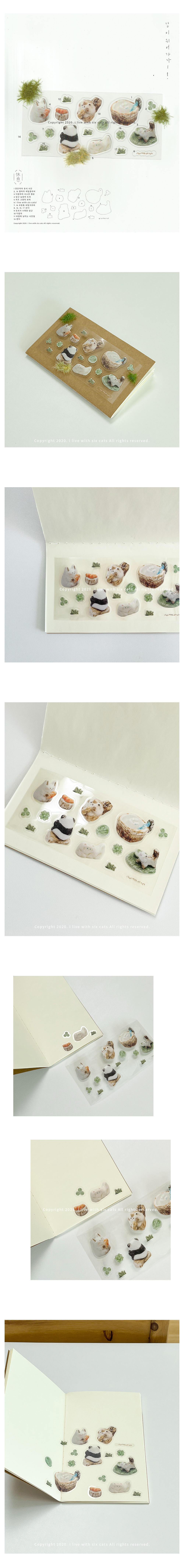옹기종기 모여서 이야기를 나누는 토끼와 다람쥐, 팬더- ! 반신욕을 즐기는 만돈이! 살랑살랑 바람을 느끼며 산책하는 다람쥐! 그런 친구들을 바라보며 마음 편히 쉬고 있는 고양이 호박이를 담았습니다. 🐈🌿