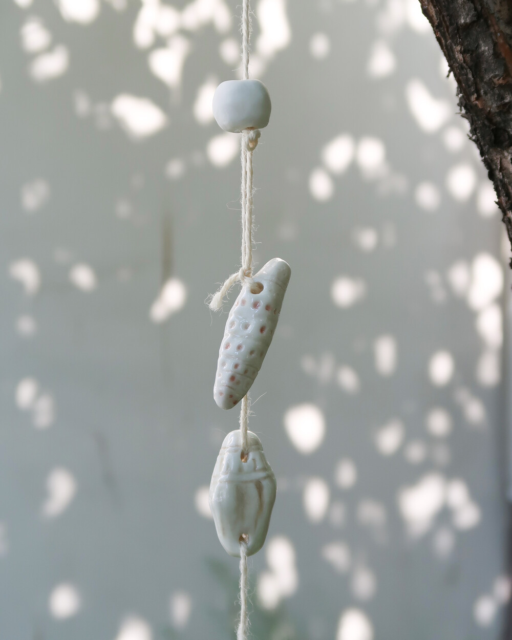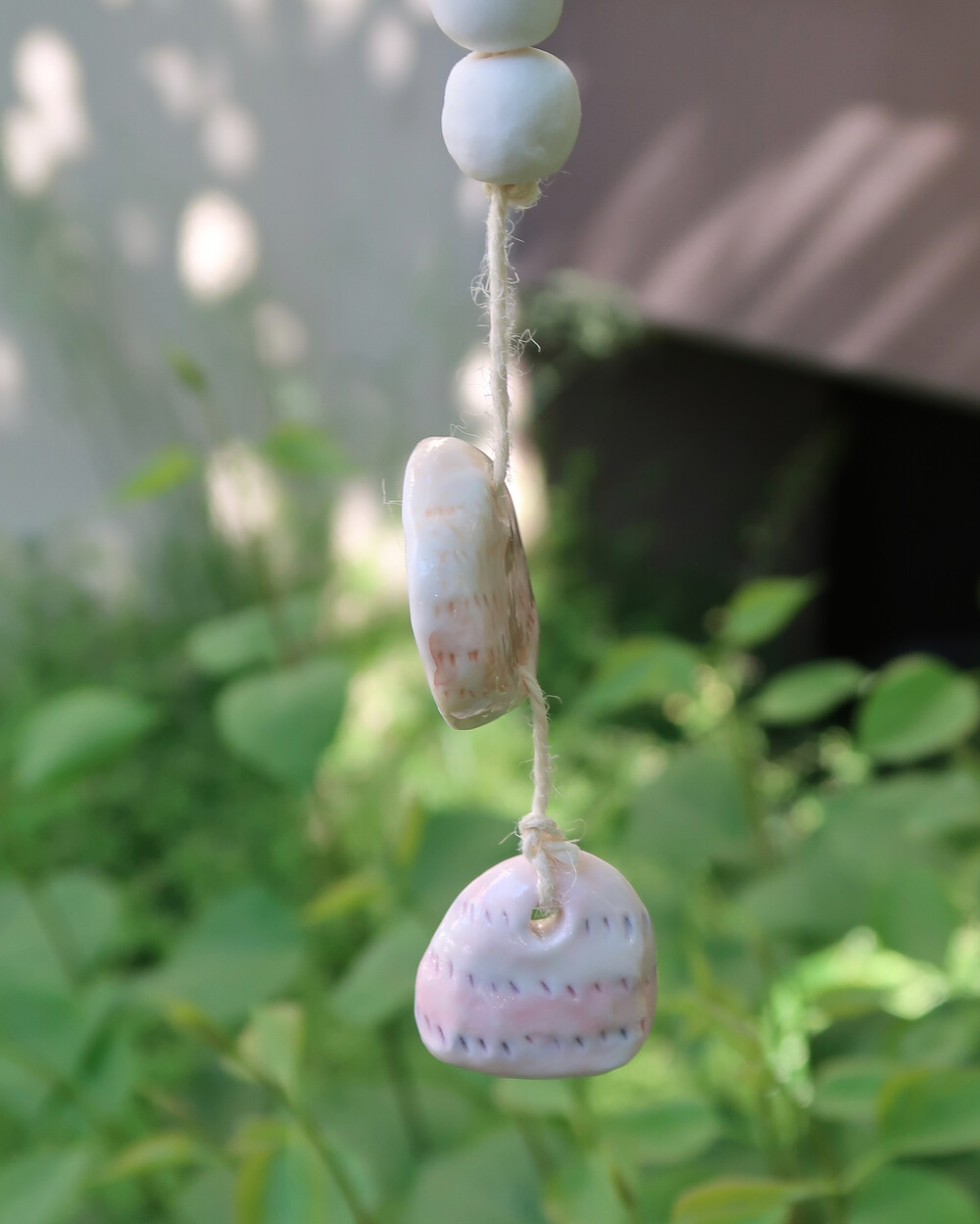 고양이들이 모은 여섯 개의 조개와 도자기 구슬들로 이루어진 모빌이에요.