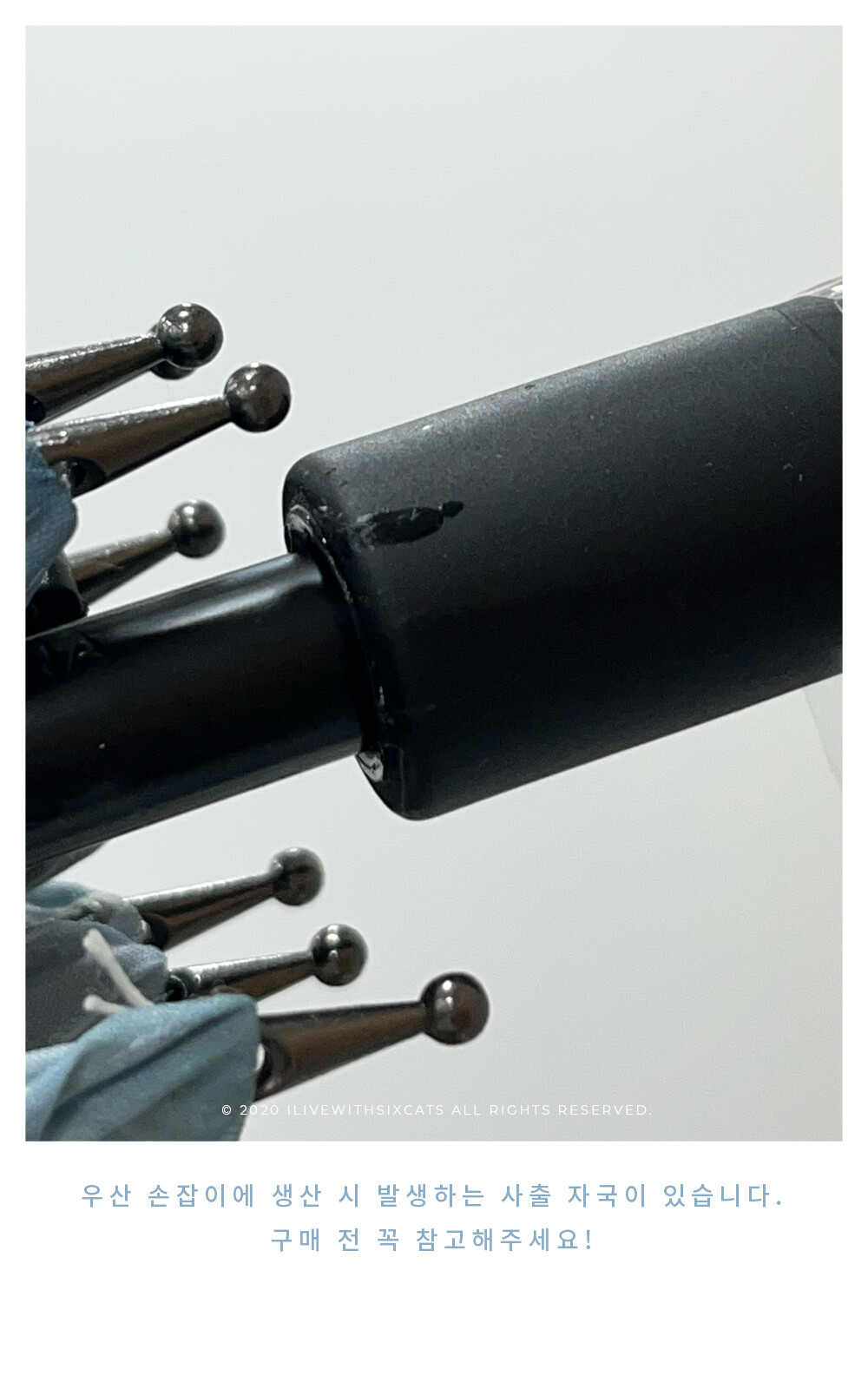 ⁞ 우산 꼭지 부분 마감 형태 및 실로 재봉된 우산 특성 상 폭우 시 쇠로 된 고리의 틈 혹은 실 사이로 물이 흐를 수 있습니다.