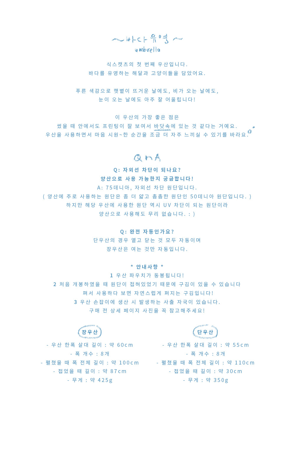 이 우산의 가장 좋은 점은 썼을 때 안에서도 프린팅이 잘 보여서 바닷속에 있는 것 같다는 거예요. 우산을 사용하면서 마음 시원~한 순간을 조금 더 자주 느끼실 수 있기를 바라요.