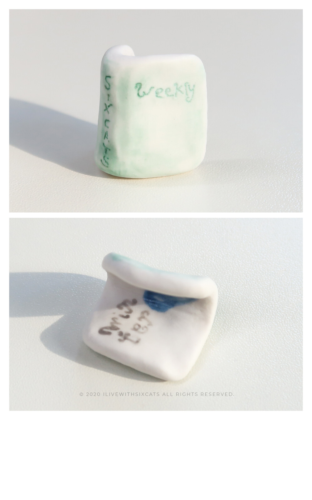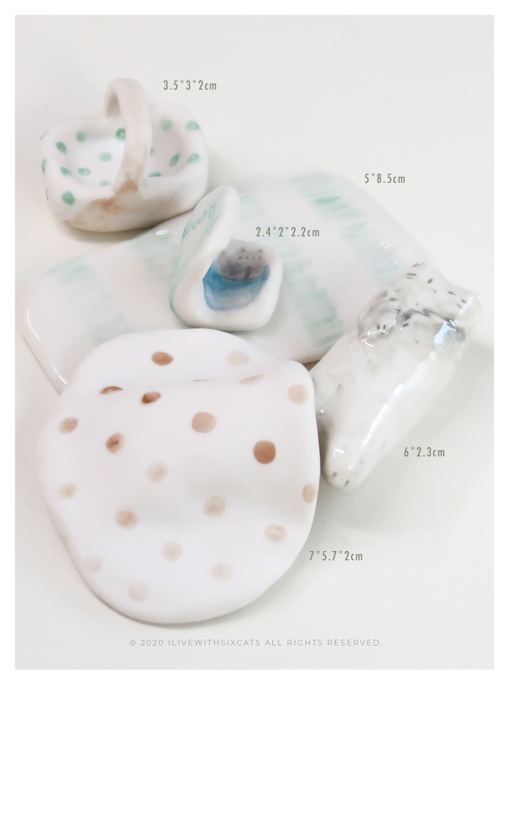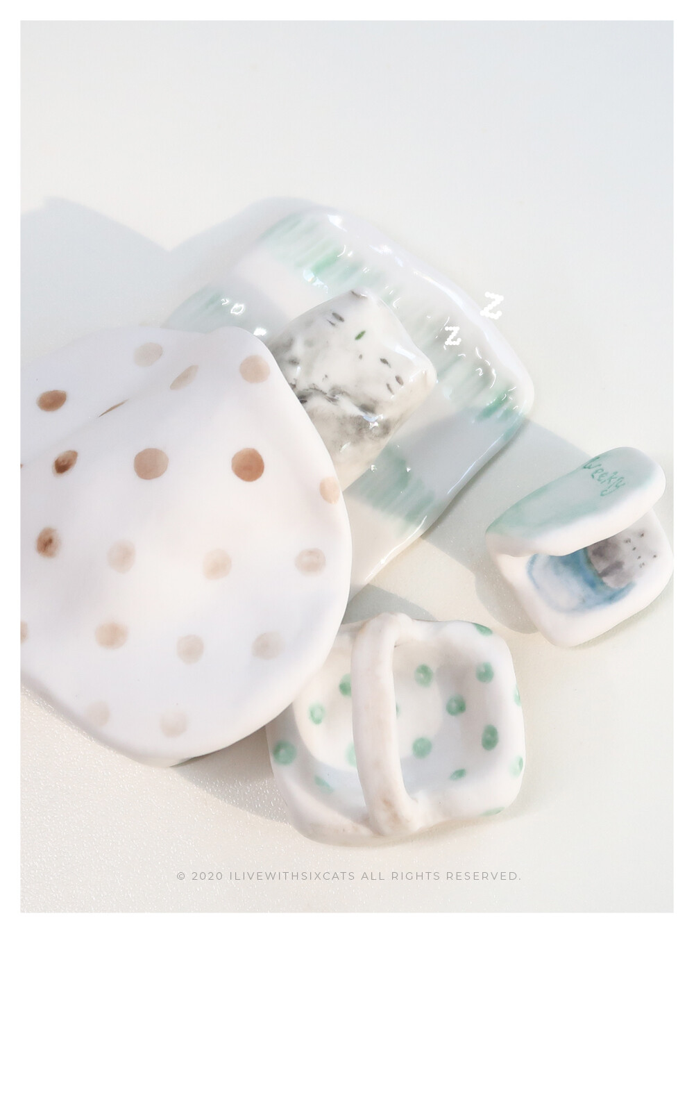 ⁞ 크기 ❶고양이 약 6*2.3(cm) ❷이불 약 7*5.7*2(cm) ❸요 약 5*8.5(cm) ❹주간도자기 책 약 2.4*2*2.2(cm) ❺바구니 약 3.5*3*2(cm)